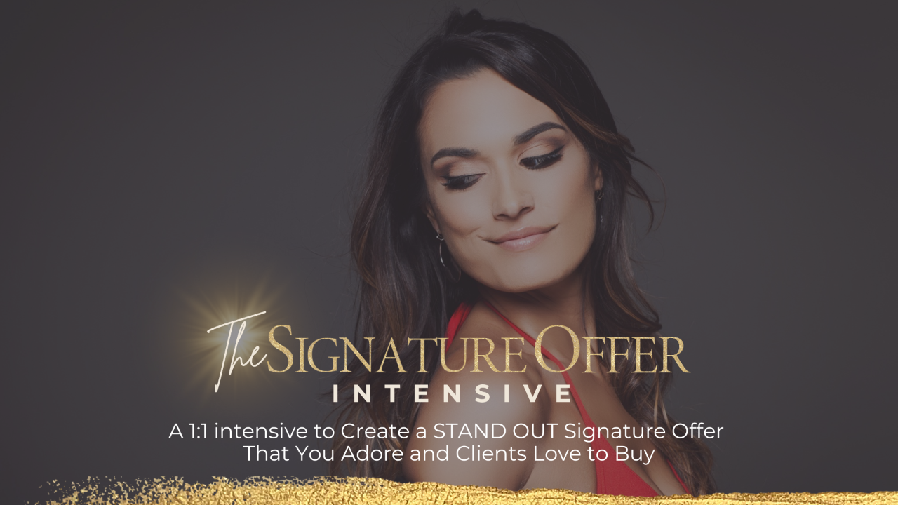 When you join the Signature Offer Intensive, you’ll discover how to build your authority and walk away with a Signature Offer you LOVE so that you can stand out with a program you adore and that clients love to buy. All without ads, a crazy launch schedule, or a big following.